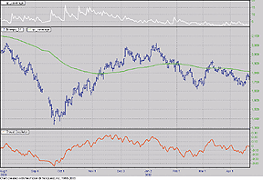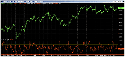 FIGURE 3: TRADESTATION, FRACTAL DIMENSION. Here's a sample TradeStation chart of the fractal dimension index.--Mark Mills