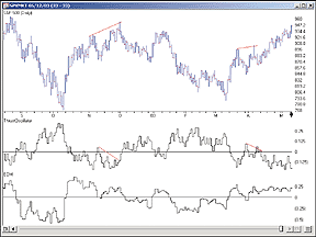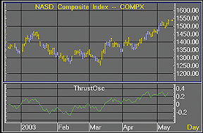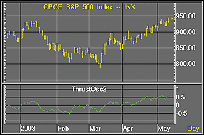 FIGURE 2: TRADESTATION, THRUST OSCILLATOR. Here's a sample TradeStation chart of the thrust oscillator.