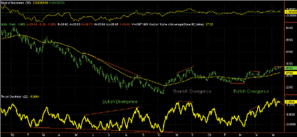 In the bottom pane, the thrust oscillator is charted. This is a 22-day exponential moving average of the thrust oscillator. The thrust oscillator can be coded in Investor/RT RTL(Real-Time Language) using a custom indicator with the following syntax:(CL($ADVQ) * CL($UVOLQ) - CL($DECLQ) * CL($DVOLQ)) / (CL($ADVQ) * CL($UVOLQ) + CL($DECLQ) * CL($DVOLQ))