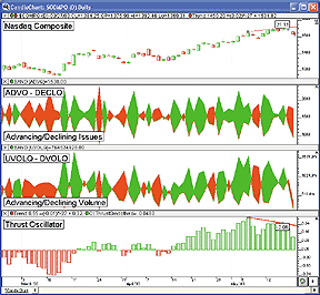 FIGURE 20: Investor/RT, THRUST OSCILLATOR. The top pane shows a candlestick chart of the NASDAQ composite index. The second pane down shows the advancing and declining issues (green when advances outnumber declines). The third pane shows the advancing and declining volume. The bottom pane shows the thrust oscillator.