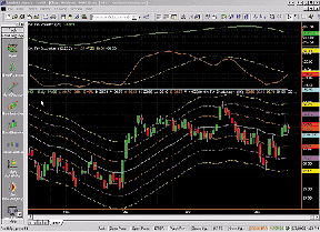 The time and money chart displays a simple moving average and six volatility bands around price, as defined in the article. Since TradeStation can show a maximum of four plots in a single indicator, we broke the code into two pieces: a ChanLinesHi indicator and a ChanLinesLo indicator.