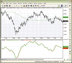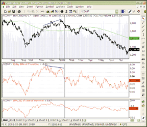 FIGURE 6: AMIBROKER, THRUST OSCILLATOR. This AmiBroker screenshot shows a daily Nasdaq composite chart with a 22-day exponential moving average of the thrust oscillator and a 35-day ease of movement oscillator. Both oscillators signal the end of an intermediate-term up rally in the beginning of January 2002.