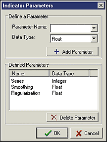 FIGURE 9: Wealth-Lab, ADDING PARAMETERS. Add three parameters, one named "Series," followed by two float parameters named "smoothing" and "regularization."