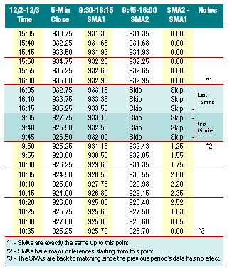 Figure 1: Effects of data reduction. Skipping the data from the first and last 15 minutes of trading affects the 10-period simple moving average.