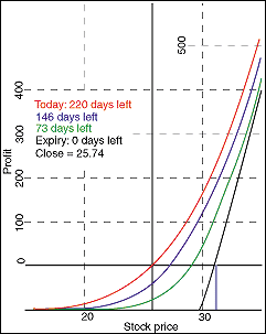 Figure 1: Risk curve. Here's a risk curve of a long call on SBC with a strike price of 30. Each of the colored lines represents the profit or loss of the position respective to the stock price at various points in time, starting from today (red line) on through to expiration (black line).If today (red line) the stock were to rise to $30, the profit in this position would be approximately $180, as noted by the vertical axis of the chart. As you can see by the black line, if SBC were to close at $30, there would be no profit. For this position to have a $180 profit at expiration, the stock would need to finish at $32.80, a $2.80 difference!