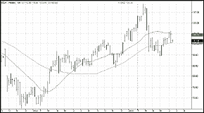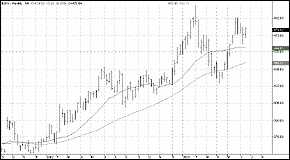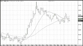 $GKX rallied in the spring and summer of 2002, breaking out above its 20- and 50-period moving averages late in the second quarter. The subgroup rallied sharply over the third quarter of 2002, peaking early in the autumn. Since that time, the agricultural subgroup has trended downward, finding support within its 20- and 50-period moving averages in the first half of 2003. Bear markets in both wheat and corn have played a significant role in the declines of the $GKX in 2003.