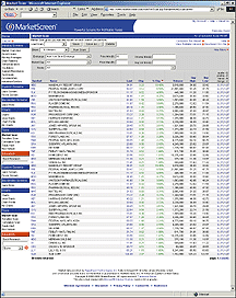 At a cost of $49.95 a month (first month free) or a yearly subscription of $439.95 (first month free plus 20% off the monthly price), MarketScreen features 10 different intraday screens, each with its own set of subcriteria into which New York Stock Exchange (NYSE), Nasdaq, and American Stock Exchange (AMEX) stocks can be filtered.