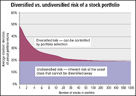 Figure 1: Diversified vs. undiversified risk of a stock portfolio. Adding more stocks to a portfolio can eliminate much of the volatility and risk. However, there is always an undiversifiable level of risk that cannot be eliminated through stock selection alone.