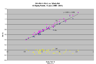 Figure 1: BUY AND HOLD RETURNS VS. STD. DEVIATION. Analyzing 40 equity funds from 1989 to 2001, you can see that the daily ROC (% return) of the mutual funds is directly proportional to their std (slope = 0.65). This shows that returns are enhanced by taking on more risk.What if the average up return is 0.8%, but the average down-day return is only -0.1%, or worse, -0.9%? This calculates to a return of 79.7%, which is considerably different from the equal return assumption. Thus, the net day concept will lead to only an approximate result. In this article, I will present data comparing the calculated gain versus actual gain of buy and hold as well as for Orls. The results may surprise you.