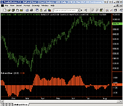 Figure 1: TRADESTATION, BULL AND BEAR BALANCE INDICATOR. Here's a sample TradeStation chart demonstrating the smoothed bull and bear balance indicator on the S&P 500 e-mini. The histogram (the red vertical lines) shows the value of the bull and bear indicator at each bar.Indicator: BullAndBear: inputs: Avg( 20 ), Smoothing( 5 ) ; variables: BullPower( 0 ), BearPower( 0 ) ; {Bull Power} If Close < Open then If Close[1] < Open then BullPower = MaxList(High - Close[1], Close - Low ) else BullPower = MaxList(High - Open, Close - Low) else If( Close > Open ) then If Close[1] > Open then BullPower = High - Low else BullPower = MaxList(Open - Close[1], High - Low ) else If( High - Close > Close - Low ) then If Close[1]< Open then BullPower = MaxList( High - Close[1], Close - Low ) else BullPower = High - Open else If High - Close < Close - Low then If Close[1] > Open then BullPower = High - Low else BullPower = MaxList(Open - Close[1], High - Low ) else If Close[1] > O then BullPower = MaxList( High - Open, Close - Low ) else If Close[1] < O then BullPower = MaxList( Open - Close[1], High - Low ) else BullPower = High - Low ; If C<O then If Close[1]>Open then BearPower = MaxList(Close[1]- Open,High - Low ) else BearPower = High - Low else If Close > Open then If Close[1] > Open then BearPower = Maxlist( Close[1] - Low, High - Close) else BearPower = Maxlist(Open - Low, High - Close ) else If High - Close > Close - Low then If Close[1] > Open then BearPower = MaxList(Close[1]-Open, High - Low ) else BearPower = High - Low else If High - Close < Close - Low then If Close[1]>Open then BearPower = MaxList(Close[1]-Low, High - Close ) else BearPower = Open - Low else If Close[1]> Open then BearPower = MaxList(Close[1]-Open, High - Low ) else If Close[1]<O then BearPower = MaxList(Open - Low, High - Close) else BearPower = High - Low ; plot1( Xaverage( XAverage( BullPower, Avg ) - XAverage( BearPower, Avg ),Smoothing ));