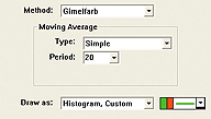 Figure 9 shows the bull power and bear power indicators in the middle pane, along with the BBB indicator in the lower pane. The bull and bear power indicators both use the same preferences, displayed in Figure 10. In this case, the Gimelfarb method was used to compute the powers. A 20-period simple moving average was used to smooth the resulting raw values. Both are drawn using the "custom histogram" drawing style, which allows multiple histograms to be overlaid (and offset horizontally) in the same pane.
