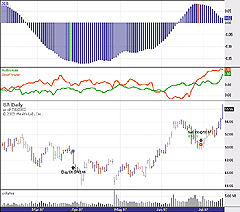 A sample trade can be seen in Figure 3. The green BBB histogram bar indicates where the indicator turned up from below zero. Note that this wasn't the true bottom of the BBB; it continued lower. One way to minimize premature signals is to use a signal line, such as a nine-period EMA of the BBB. The entry signal would occur when BBB crosses above the signal line.