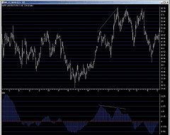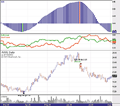 FIGURE 2: AMIBROKER, Bull-Bear Balance. This AmiBroker chart shows a daily Barr Laboratories chart and the double-smoothed bull-bear balance (BBB) indicator (lower pane). The negative divergence between price action and BBB shows clearly that the uptrend is ending.--Tomasz Janeczko, AmiBroker.comGO BACK