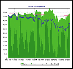 Another sample trade on Apple Computer can be seen in Figure 4. The system did exceptionally well on Apple, logging 30 out of 44 winning trades, and beating buy and hold at all levels. We next tested the system on a portfolio of the 30 Dow Jones industrials over a four-year period. Each trade was sized so that it would equal 4% of the current portfolio equity level. The system was profitable, returning a 5.93% profit, while a buy and hold strategy returned a loss of -19.37% for the same testing period (Figure 5).
