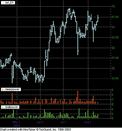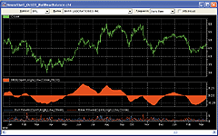 FIGURE 7: NEOTICKER, BULL AND BEAR POWER INDICATORS. Here's a sample chart showing the bull power indicator and the bear power indicator in NeoTicker.