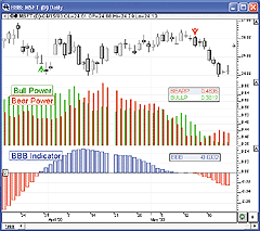 Figure 9: Investor/RT, BULL POWER AND BEAR POWER. This Investor/RT daily candlestick chart of MSFT shows bull power (green) and bear power (red) indicators in the middle pane (drawn as custom histograms) along with the BBB custom indicator in the lower pane.