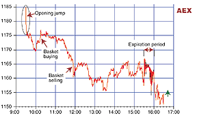 Options expiration normally takes place on the third Friday of the month. A number of options series expire on this day, including stock, index, and futures options. The expiration (or settlement) price of the AEX is determined by averaging values between 3:30 and 4:00 pm using 31 one-minute samples. On the intraday chart in Figure 1, it is clear that the expiration period is more active. This proves that the option expiration affects market movements.