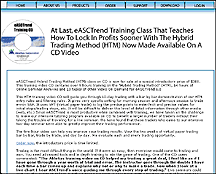 eASCTrend has introduced its Hybrid Trading Method (HTM) class on video CD, now on sale. This CD contains more than five hours' training on the method, 14 hours of online seminar archives, and 13 topics of other video on demand for eASCTrend 6.0. This HTM training video CD will guide the user through 10-day trading with a bar-by-bar demonstration of HTM entry rules and filtering rules, giving a specific setting for the morning session and the afternoon session to trade e-mini S&P.