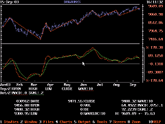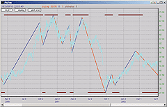 You can use just one study, or combine them to compare the differences both between point and percentage criteria, as well as between the classic zigzag and the ZZT.The Prophet JavaChart shown in Figure 9, for example, shows the zigzag indicator laid on top of the price chart, using an 8% move as its basis. Raftopoulos's new ZZT indicator is shown beneath, using similar criteria. The differences between these two, as mentioned in the article, can be seen clearly. The ZZT, as a binary indicator, oscillates between +1 (blue line at the top of the graph) and -1 (blue line on the bottom), with the changes represented by the vertical blue line.