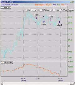 Equity Monaco can perform Monte Carlo simulations on trading system results directly from NeoTicker or on generic text files containing trading results. For example, we can perform a Monte Carlo simulation on a basic moving average crossover system using Microsoft five-minute data over 25 days. To do so, load the Microsoft data into a chart; then add the Backtest EZ indicator onto the five-minute MSFT data. Set the long entry rule to xabove (average (data1, 10), average (data1, 30)), and short entry rule to xbelow (average (data1, 10), average (data1, 30)). Set the Size parameter to 100. Click the Apply button to run the system. The resulting equity curve of the moving average crossover system will be displayed (Figure 11). Right-click on the Backtest EZ indicator legend, and select Trading System>Save Performance File from the popup menu. This saved performance report will be used in Equity Monaco later.