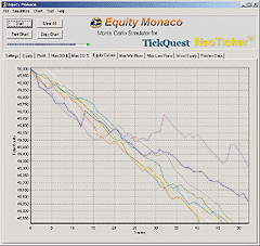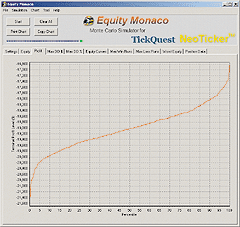 Figure 11: NEOTICKER, MONTE CARLO SIMULATION. Here's a sample NeoTicker chart showing the resulting equity curve for Microsoft when a Monte Carlo simulation is run on a moving average crossover system using NeoTicker's Equity Monaco freeware tool.