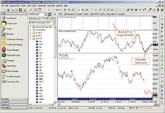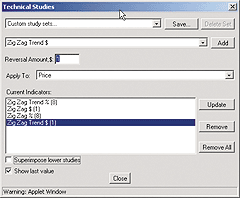 You can choose any or all of these indicators within the Technical Studies dialog box (Figure 8), and you can set the percentage or point move for any of them in the Reversal Amount box; the figure you entered will be shown parenthetically with the indicator itself.ZigZag %--The classic zigzag indicator, using percent changes in price as its basis ZigZag $--The classic zigzag indicator, using point moves in price as its basis ZigZag Trend %--Raftopoulous's indicator, using percent changes in price as its basis ZigZag Trend $--Raftopoulous's indicator, using point changes in price as its basis