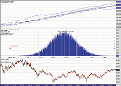 Figure 6: WEALTH-LAB, MONTE CARLO SIMULATION. Random equity curves and the Monte Carlo probability distribution are plotted in separate panes on an arbitrary chart window.