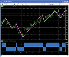 Figure 1: TRADESTATION, ZIGZAG TREND INDICATOR. TradeStation's built-in zigzag indicator performs the retracement-based zigzag validity charting. As described in Spyros Raftopoulos's article, the zigzag trend indicator can be applied to calculated values rather than price data. Here, Chande momentum oscillator (CMO) zigzags are displayed.