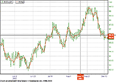 First, the linear regression indicator is the same as NeoTicker's built-in indicator linear regression value. To recreate in NeoTicker the US dollar index chart in the article, load the daily chart of DX and add the linear regression value indicator to the chart with period "5" and projection "0" (Figure 12).