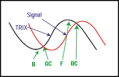 4 EMA3: Calculate the n-period EMA of EMA2.TRIX = (EMA3[today] - EMA3 [yesterday]) / EMA3[yesterday]TRIX usually has two components. The first component is called TRIX, which is shown as a black line in Figure 1. The second component is called the signal line, which is shown in red on Figure 1. This is the n-period EMA of the TRIX and is used to eliminate false signals. I often use the value 3 as the number of periods.