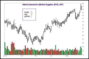 All figures in this article show high-low-close prices -- that is, no opening price. Figure 1 illustrates our first pattern, inside days, on the daily scale. Look at the inset for a closer view of the pattern. An inside day is within the boundary of the prior day's range (hence its name). The second day has a lower high and higher low -- a narrowing of the price range. No ties are allowed (the two days cannot share the same high or low price). Where the stock opens or closes is not important, and the second day need not be centered in the first day's price range. The inset shows the second day's price range to be above the midpoint of the prior day.
