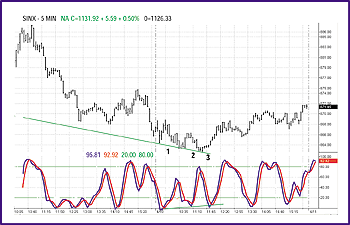 The first one I learned to use and still like is stochastic divergence. This was developed by George Lane and is available on virtually any charting software. In Figure 1, I have reproduced stochastic divergence on a five-minute chart of the Standard & Poor's 500 index from April 10, 2003.