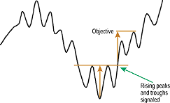 We often think of price patterns as a single indicator, but in reality they encompass many basic technical principles. First is the concept of peak/trough analysis, which forms the basis of Dow theory. The idea behind this concept is that it is possible to recognize an incoming tide every time you spot a record wave, and vice versa. A rising trend in markets is also identified by each rally (wave) that surpasses its predecessor. By the same token, each low is set at a progressively higher level.