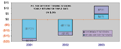 FIGURE 1: PERFORMANCE DIFFERENCES. In 2003, 61% of the yearly dollar increase was in the overnight session.Recently, this pattern of strength is becoming more noticeable. In the 60 trading days from 10/31/2003 to 1/28/2004, the dollar gain in the triple Qs was $1.71; however, the gain during the overnight session was $3.22, clearly overshadowing the performance of the regular session. With such a growing discrepancy, it is apparent that traders are placing more emphasis on the overnight session rather than focusing on yesterday's overall change in price in relation to trading activity.