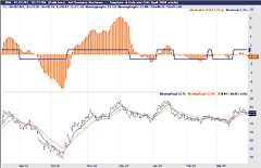 Calculations presented in the article can be easily reproduced using AmiBroker Formula Language. The only tricky part is a piecewise exponential moving average that restarts the calculations on every moving average crossover, but we managed to implement it in two lines of code, thanks to AmiBroker's powerful Ama2 function, which allows easy implementation of all kinds of single-order infinite impulse response filters.