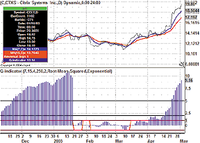 FIGURE 14: TRADE NAVIGATOR, Q-INDICATOR. This sample Trade Navigator chart shows the Q-indicator along with the reversal indicator on an IBM daily chart.Here is the TradeSense code for five indicators: reversal, cumulative price change (CPC), trend, noise, and the Q-indicator. The formulas are intended for use within the Trade Navigator Gold and Platinum versions, but we could also provide a special file for Trade Navigator Silver users.