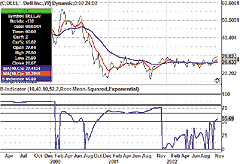 FIGURE 1:TRADESTATION, TREND-QUALITY INDICATOR. This sample TradeStation chart shows the trend-quality (Q-indicator) and trend-periods indicators on a weekly chart of Dell with seven-period and 15-period moving averages. The red line is the trend-quality indicator.--Mark Mills