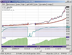 FIGURE 6: WEALTH-LAB, TREND-QUALITY INDICATORS. The Trend Q, B demo system uses the indicators to enter and exit the market.Note that the Q and B scalar parameters, whose values are rather arbitrary here, can be tweaked or optimized to improve performance.