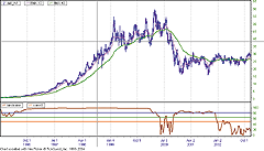 FIGURE 9: NEOTICKER, TREND-NOISE BALANCE INDICATOR. Here's the B-indicator as plotted in NeoTicker.A downloadable version of the indicators will be available from the Yahoo! NeoTicker user group file area at https://groups.yahoo.com/group/neoticker/.LISTING 1 LPF1 := qc_xaverage(c, param1); LPF2 := qc_xaverage(c, param2); REVERSAL := LPF1-LPF2; PeriodA := if((REVERSAL > 0) and (REVERSAL(1) <= 0), 0, PeriodA+1); PeriodB := if((REVERSAL < 0) and (REVERSAL(1) >= 0), 0, PeriodB+1); PERIODS := if(REVERSAL > 0, PeriodA, PeriodB); DC := c-c(1); CPC := varsum(DC,PERIODS); TREND := qc_xaverage(CPC, param3); myDT := CPC - TREND; myDT_abs := absvalue(myDT); NOISE := param5*average(myDT_abs, param4); plot1 := TREND/NOISE; LISTING 2 LPF1 := qc_xaverage(c, param1); LPF2 := qc_xaverage(c, param2); REVERSAL := LPF1-LPF2; PeriodA := if((REVERSAL > 0) and (REVERSAL(1) <= 0), 0, PeriodA+1); PeriodB := if((REVERSAL < 0) and (REVERSAL(1) >= 0), 0, PeriodB+1); PERIODS := if(REVERSAL > 0, PeriodA, PeriodB); DC := c-c(1); CPC := varsum(DC,PERIODS); TREND := qc_xaverage(CPC, param3); myDT := CPC - TREND; myDT_abs := absvalue(myDT); NOISE := param5*average(myDT_abs, param4); plot1 := if((absvalue(TREND)+absvalue(NOISE)) > 0, absvalue(TREND)/(absvalue(TREND)+absvalue(NOISE))*100, 0); success1 := if((absvalue(TREND)+absvalue(NOISE)) > 0, 1, 0);--Kenneth Yuen, TickQuest Inc.