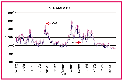 Figure 1: VIX and VXO. Both have been falling to low levels in late 2003.