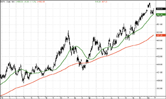 The precious metals subgroup has been the true star of the commodities indexes. Although this subgroup did dip below its 200-day moving average late in the spring of 2003, the precious metals subgroup has moved upward in a vigorous bull market ever since. The volatility of this subgroup is such that it has frequently dipped below its 50-day moving average. Nevertheless, the 50-day moving average has provided a significant amount of support to the precious metals subgroup's advance since the autumn of 2003.