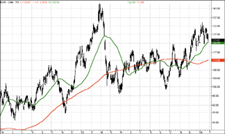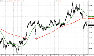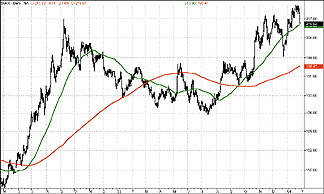 The livestock subgroup broke out of a sideways correction early in the autumn of 2003 - a correction that began back in November 2002. It was in August 2003 that the 50- and 200-day moving averages converged and, though they did not cross and thus there was no breakout of the 50-day moving average over the 200-day, the 50-day moving average did accelerate to the upside shortly after this convergence as livestock prices surged. By December 2003, however, the livestock group was experiencing a correction that was every bit as sharp as the August 2003 rally. Although appearing to find some measure of support in the area of the November 2002-August 2003 consolidation range, the livestock subgroup remains below its 200-day moving average.