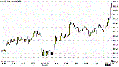 FIGURE 1: ARBITRAGEURS AT WORK. On this five-minute chart of the S&P 500, notice how the index fell 2.5 points within minutes of the open.