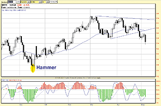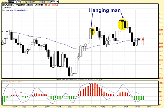 FIGURE 1: HAMMER. This hammer appeared in the retail index ($MVR) in mid-December, anticipating a significant low.Consider the pair of hanging man candlesticks in Figure 2, the chart of the Dow Jones Transportation Average (DJTA). Here, the candlesticks were arguably less definitive, but traders waiting for confirmation in the form of prices moving below the low of the reversal candlestick would have been rewarded. Note first how the hanging man develops in early April. Prices close higher the following day, but by the second day after the hanging man, there was clear evidence that the odds were shifting toward the downside. Three days later, the transports were searching for support on their 50-day exponential moving average (EMA).