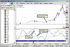 FIGURE 1: TRADESTATION, VFI-PRICE DIVERGENCE. This sample TradeStation chart shows Markos Katsanos' volume flow indicator on Foamex International (FMXI) along with the VFI-price divergence indicator.
