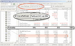 The trend-break method (test 3 in the article) worked out quite well on Corning Inc. However, we noticed that this interpretation can prematurely exit other strongly trending stocks, and largely for this reason, we were inclined to heed Katsanos' advice about not using VFI as an overbought/oversold indicator to reverse the position.Katsanos also reintroduced Michael Harris's profitability metric. Though Wealth-Lab is complete with scores of standard metrics, this particular measure of profitability is not one of them. However, in WLB 3.0, you can add any metric that you wish to the Performance report by programming it in a PerfScript, of which the result can be seen in Figure 5.