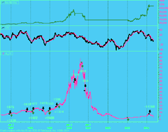 FIGURE 6: NEUROSHELL TRADER, VOLUME FLOW INDICATOR. Here's a sample chart in NeuroShell Trader displaying all four trading strategies discussed by Markos Katsanos in his article this issue. The techniques implement the volume flow indicator.