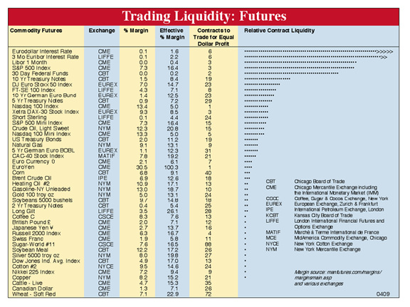 Trading Liquidity: Futures is a reference chart for speculators. It compares markets according to their per-contract potential for profit and how easily contracts can be bought or sold (i.e., trading liquidity). Each is a proportional measure and is meaningful only when compared to others in the same column. The number in the "Contracts to Trade for Equal Dollar Profit" column shows how many contracts of one commodity must be traded to obtain the same potential return as another commodity. Contracts to Trade = (Tick $ value) x (3-year Maximum Price Excursion). "Relative Contract Liquidity" places commodities in descending order according to how easily all of their contracts can be traded. Commodities at the top of the list are easiest to buy and sell; commodities at the bottom of the list are the most difficult. "Relative Contract Liquidity" is the number of contracts to trade times total open interest times a volume factor, which is the greater of: 1 or exp (1n (volume) / 1n (5000)) - 2.