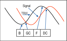 Figure 1: Trading with the TRIX. Here you see the bounce (B), golden cross (GC), fall (F), and dead cross (DC).