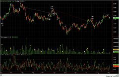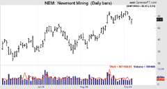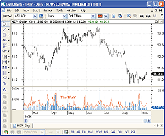 FIGURE 11: NEOTICKER, TRsV. Here is the TRsV indicator and the volume indicator plotted in the same pane on Newmont Mining Corp.